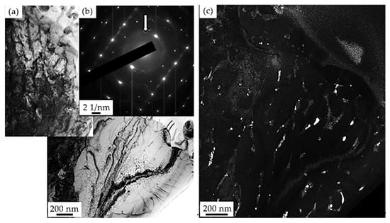 Electron microscopic image of the structure of HEA surface layer formed as a result of irradiation of the “film/substrate” system with a pulsed electron beam (ES = 20 J/cm2); (a)—bright-field image; (b)—microelectron diffraction pattern obtained from this section of the foil; (c)—dark-field image obtained in [111]CrB + [131]Cr3NiB6 reflections. In (b), the arrow indicates the reflection in which the dark-field image was obtained (c).