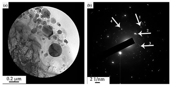 Electron microscopic image of the structure of HEA surface layer formed as a result of irradiation of the “film/substrate” system with a pulsed electron beam; (a)—foil section bounded by the selector diaphragm of the electron microscope; (b)—microelectron diffraction pattern obtained from area (a). The arrows in (b) indicate the reflections in which the dark-field images shown in Figure 16 (reflections 1 and 2) and in Figure 17 (reflections 3 and 4).