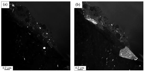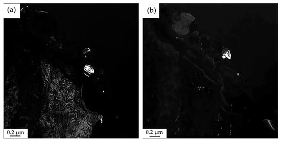 As shown in Figure 16a, the dark-field image, obtained in the reflection given in Figure 15b under No. 1, indicates that the spherical particles are formed by a solid solution based on the chromium crystal lattice. Simultaneously with chromium particles, the HEA layer adjacent to the coating is illuminated in the dark-field image. Figure 16b shows a dark-field image obtained in the reflection shown in Figure 15b under No. 2. Analysis of the microelectron diffraction pattern in Figure 15b indicates that the detected particles are a phase of the composition Cr3NiB6.