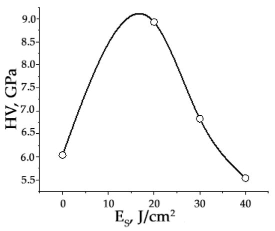 Microhardness dependence of the surface layer of “film/substrate” system on the energy density of the electron beam. The HEA microhardness in the initial state is 4.7 GPa.