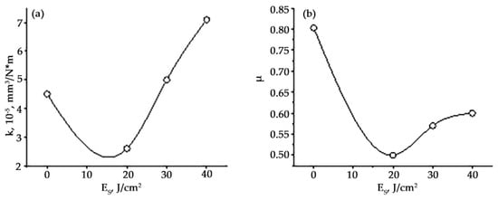 Second, the wear resistance of the samples increases (by more than 5 times), and the friction coefficient decreases (by 1.3 times), reaching the best values after irradiation of the “film/substrate” system with a pulsed electron beam with an electron beam energy density of 20 J/cm2 (Figure 19).