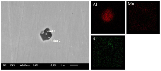 The morphology and composition of inclusions were characterized through SEM ( SEM: JSM-6510LV, JEOL, Tokyo, Japan) and EDS ( EDS: INCA Feature X-Max 20, OXFORD Instruments, Oxford, UK). The EDS data processing is carried out according to Wang Xinhua et al. [20]. Firstly, iron was excluded to avoid signals from the steel matrix, and oxygen was removed due to insufficient accuracy. Then, the content of remaining elements was normalized to 100%, and expressed as mass percentage.