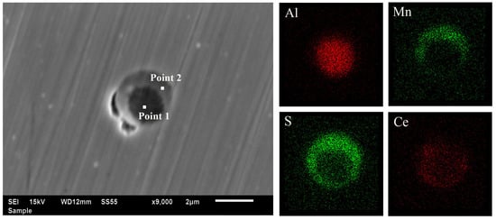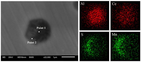 From the view of composition, it can be seen that CeO2 addition led to the oxide evolution from Al–O to Ce–Al–O, which demonstrates its validity. To confirm this conclusion, more than 1000 oxides were analyzed for the 2# sample, and 51.9% of them (number percentage) could be classified as Ce-bearing oxides. Moreover, in these Ce-bearing oxides, the average mass percentage of Ce and Al are 34.7% and 47.8% after normalization, respectively. The remaining are Mn and S, which is attributed to MnS segregation. It is well known that during the solidification process, MnS prefers to heterogeneously nucleate on pre-existing oxides and results in accumulation of sulfur and Mn around them. This is consistent with its appearance in Figure 2.