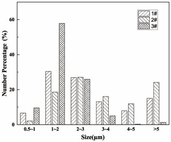 Firstly, the size distribution of oxides for all samples is presented in Figure 4, and each average oxide size is shown in Table 4. It can be seen that by keeping the adding weight of CeO2 and other experiment conditions constant, increasing the Si quantity leads to a decrease in oxide average size. This refinement is due to two reasons. On the one hand, the dissolution of Si in the melt around CeO2 can improve the wettability between CeO2 and molten steel and make its addition more effective, which means higher Ce content. In fact, Song et al. has indicated that the inclusions can be obviously refined after being treated by Ce [12]. On the other hand, more Si powder means better dispersion conditions of CeO2 nanoparticles. Thus, the nucleation sites for oxide formation are increased, which leads to refinement.