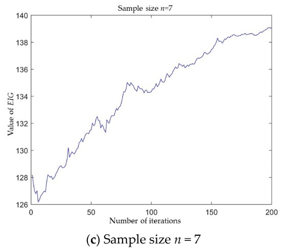 EIG for the same test cost. This is because as the number of samples decreases, the cost required for the test samples decreases, allowing more test costs to be spent on the implementation of the test. Conducting the test over a long period of time and collecting more degradation data of the tested motorized spindle, allows the obtaining of a stable posterior distribution of the model parameters. Moreover, the stress levels of the three optimal plans all fluctuate within the same range, indicating that the stress levels in the table are the sensitive stress levels for the accelerated degradation test of the spindle under this objective function, i.e., the optimal test stress levels for this model of the motorized spindle. Although the values of each stress level of the three optimal plans fluctuate in the same range, the values of the low sample size stress levels are all slightly lower than the values of the high sample size stress levels. That is because fewer resources are used to implement the test in the high sample size solution, and the high-stress level values can obtain the degradation information of the motorized spindle faster and thus obtain larger objective function values. The reason for the lower stress values in the low sample size optimal plan is, the closer to the normal stress level of the motorized spindle, the smaller the fluctuation of the a posteriori distribution of the obtained model parameters or even reaches stability, thus making the objective function reach its theoretical maximum.
