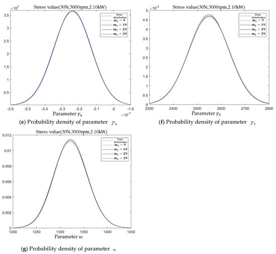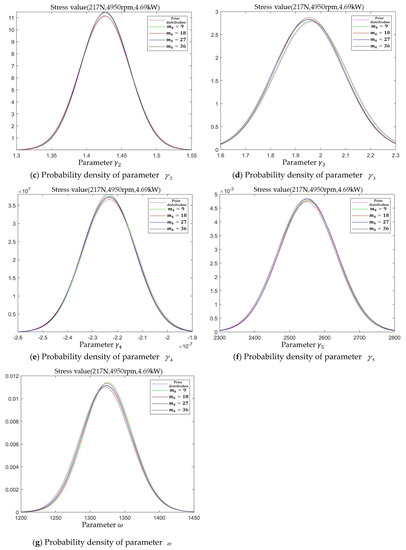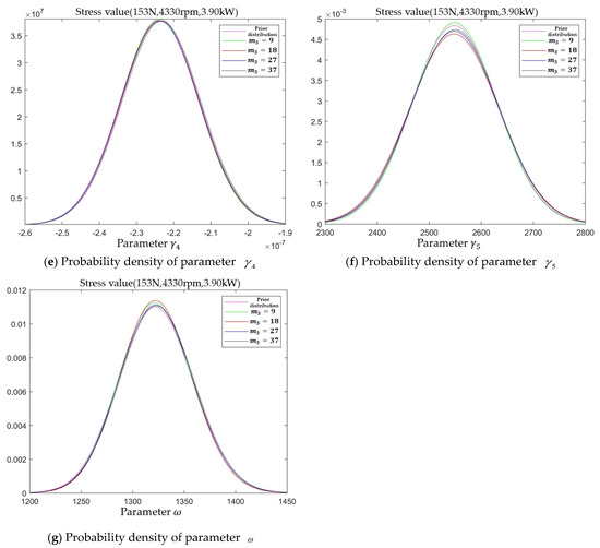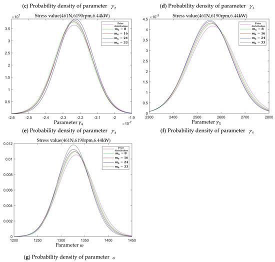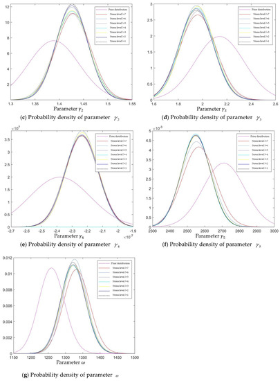 Figure 8 that the shifting of the probability density function is weakened compared with the previous stress level. Nevertheless, the posterior distribution probability density function of each model parameter still has large variations, some of which are the shifting of the mean value of the model parameter and some of which are the fluctuations of the variance. This indicates that there are still deviations between the posterior distribution probability density of each model parameter and the true value at this stage, and the chance of the probability density function has not been completely eliminated, so it is necessary to continue the test.
