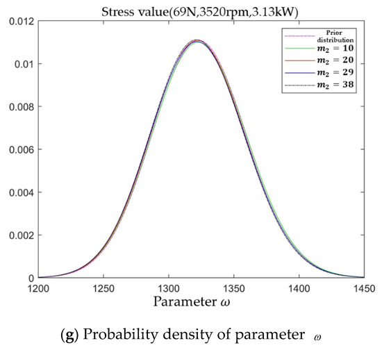 Figure 7, it can be obtained that there is a certain deviation between the prior distribution probability density functions of the model parameters based on the prior data of different models of machining center motorized spindles and the tested motorized spindles. In addition, the posterior probability density function of each model parameter generally has the phenomenon of peak shift and variance increase of the distribution graph with the increase in the number of inspections. This is because the posterior distribution probability density function of each model parameter obtained by solving at