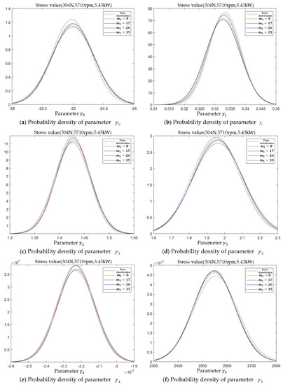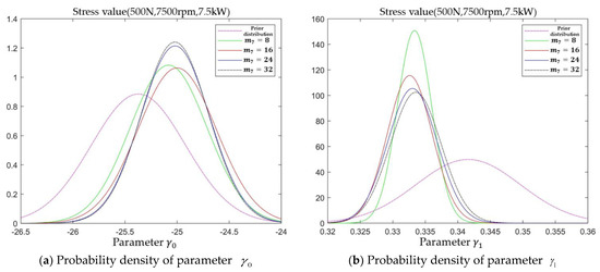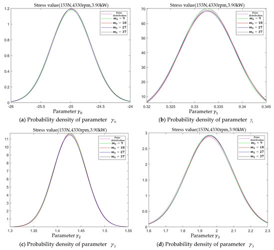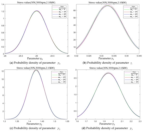 In Figure 12 there is a significant change between the posterior distribution probability density functions of parameters , , and the prior probability density functions, where , and are variance fluctuations and is the mean shift. In particular, the posterior distribution of parameter at the previous two stress levels has converged to a steady state, but the variance of the experimental parameter at this stress level again appears to fluctuate significantly. The above changes in the posterior probability density functions of the parameters indicate that after incorporating the incremental degradation data of the motorized spindle under this stress level, the steady state of the probability density function of each model parameter distribution after the end of the previous stress level is “breaks”. According to the analysis, the changes in the posterior distribution of , and are because the randomness of the motorized spindle under this stress level is different from the previous stress level. The change of is because the value reaches the false true value at the previous stress level, and continues to approach the true value under this stress level. The change of parameters , , and prove the necessity of continuing the test. However, as the number of inspections at this stress level increases, the change in the probability density function of the posterior distribution of the model parameters gradually decreases. This indicates that with the incorporation of the degradation increment data at this stress level, the posterior distribution of the model parameters at the performed stress level has converged to the true value, i.e., the model can be used to evaluate the reliability of the spindle within the performed stress level. However, there is a certain span between this stress level and the normal stress level. In order to avoid the recurrence of this phenomenon after incorporating the data at the normal stress level, and to ensure the extrapolation accuracy of the model at the normal stress level, a test at the normal stress level (l = 1) is required. According to the test plan, the test of normal stress level (l = 1) is implemented, and the probability density of the posterior distribution of each model parameter is shown in Figure 13.