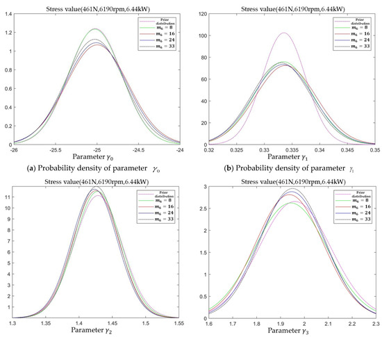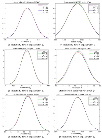 The posterior distribution probability density function of each model parameter obtained at m7 = 32 is used as the prior distribution probability density of each model parameter at stress level l = 6. The process of updating the posterior distribution of each model parameter with the increment data of performance degradation is shown in Figure 8.