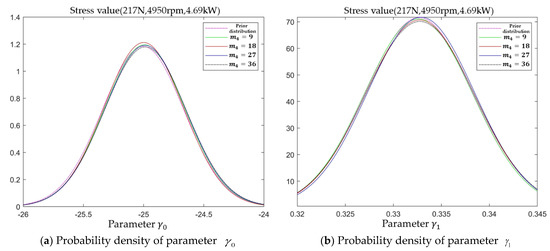 At the end of this stress level, IG = 71.918 > EIG = 28.0621, which satisfies the sequential truncation basis, and there are only minor fluctuations in the mean and variance of the posterior distribution probability density functions of the model parameters in Figure 10. This indicates that the posterior distribution of each model parameter is close to the true value of the model parameters; especially the probability density function of the prior distribution of parameter at this stress level basically coincides with the probability density function of the posterior distribution. However, because the accelerated model needs to be extrapolated to assess the reliability of the spindle at the normal stress level when evaluating the reliability of the spindle, some of the evaluation accuracy is lost. Therefore, although the fluctuation of the posterior distribution probability density of each model parameter is small at this time, the fluctuation of the posterior distribution probability density function needs to be completely eliminated in order to ensure the evaluation accuracy at the normal stress level, so the test at the next stress level is also required. According to the selected test plan, the test of stress level l = 3 was conducted, and the posterior distribution of each model parameter is shown in Figure 11.