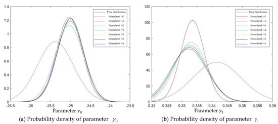 It can also be seen from Figure 14 that compared with the span of the prior distribution and the posterior distribution, the span of the posterior distribution and the posterior distribution after the first stress in the test is significantly reduced, which proves the necessity of dynamic adjustment of the test plan in the test when the prior information is poor. In addition, the probability density of the posterior distribution of the model parameters at the first few stress levels (l 4) is dominated by the shift of the mean, i.e., towards the true value of the model. The probability densities of the posterior distributions of the model parameters at the latter stress levels are dominated by the variance shifts, i.e., the distributions are adjusted according to the differences in the samples. In addition, the posterior probability densities of most of the model parameters have leveled off after the fifth stress level (l = 3). Especially after the seventh stress level has been carried out for a period of time, the posterior distribution probability densities of each model parameter almost do not change anymore, indicating that the parameters have reached the true values of the samples, which in turn proves the availability of the method in optimizing the test plan.