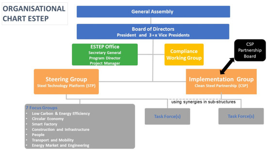 ESTEP, the main coordinator of CSP, is a non-profit organization according to Belgian law (international ASBL) [70]. The mission of ESTEP is to engage in collaborative EU actions and projects using technologies that tackle EU challenges (notably on renewable energy, climate change, i.e., low-carbon emissions, and CE) to create a sustainable EU steel industry. Figure 1 shows the organizational structure of ESTEP [70].