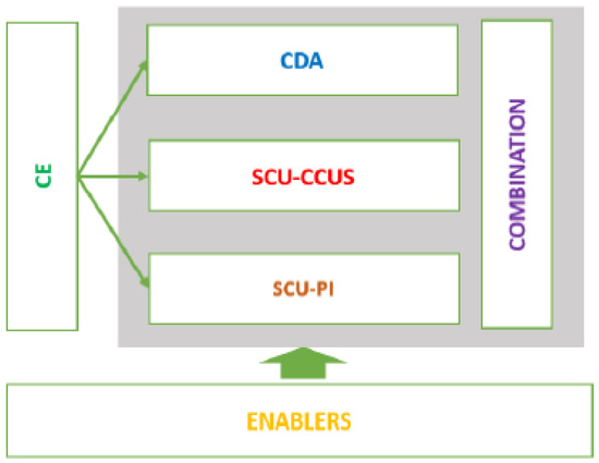 The aforementioned technological pathways comprising CDA, SCU, and CE represent four of the six AoIs. CDA means steel production using hydrogen or renewable “green” electricity. SCU is separated into two sub-parts: CCUS (carbon capture, utilization, storage) and PI (process integration). CCU (carbon capture, utilization) encompasses technologies that use CO and CO2 in steel plant gasses or fumes as raw materials for production or integration into valuable products. PI allows for the reduction of fossil fuels (coal, natural gas, etc.) that are used in both BF-BOF and EAF steel production to reduce the CO2 emissions generated by the steel industry. In addition to the CE, enablers are another AoI. This field includes integrating technologies, such as artificial intelligence and digital solutions, into industrial production. The development of new measurement techniques and digital tools for monitoring and control in the new steel production processes, new predictive and dynamic models, and strategic scheduling tools are examples of enablers that will ensure the planning, assessment, and optimization of the industrial transition process toward a climate-neutral steel sector [71,72]. The last AoI (denoted as “combination” in Figure 2 above) defines research initiatives in which the different pathways interact with each other [69].