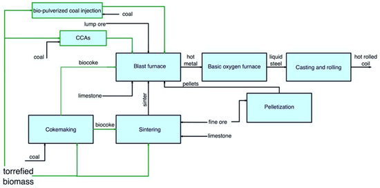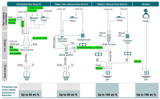 Iron and steelmaking can be principally conducted by four routes: BF/BOF, scrap/EAF, DRI/EAF, and SR/BOF [69,73]. The BF/BOF route includes cokemaking, iron ore sintering, iron ore pelletizing, BF-based ironmaking, casting, rolling, and power stations [74]. Current BFs operate with 70–80% sinter, 20–30% pellets, and 10–20% lump iron ore [75]. Figure 3 shows the four main iron and steelmaking routes using coal or coke that can be considered for the integrated use of secondary carbon bio-carriers.