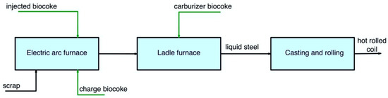 Biomass is considered a valuable renewable energy source [1]. Given that the iron and steel industry is one of the most energy- and emission-intensive industrial sectors, the use of substitutes for conventional fossil fuels is an extremely attractive option. The iron and steel industry is responsible for approximately 1.83 tons of CO2 per ton of crude steel (for BF/BOF route), with major amounts from the blast furnace (BFs), cokemaking ovens, sintering, pelletizing, iron alloy furnaces, and other processes [2,3,4]. To reduce the negative impact on the environment [5,6,7], to reduce CO2 emissions by 50% until 2030, and reach climate neutrality (zero net CO2 emissions by 2050) [8], as well as to reduce the use of critical materials, such as coal [9,10,11], a considerable amount of research has been carried out on the use of carbon-bearing substitute materials. For instance, biomass has promising potential as a fuel and reductant, but its application in the metallurgical industry has limitations. Numerous studies have concluded that biomass utilization has good potential for the partial replacement of fossil fuels and reducing agents in metallurgical coke production [12,13,14,15,16,17,18,19,20], as carbonaceous fuel in iron ore sintering [21,22,23,24], in iron ore pellet production [25], pulverized injection into the BF [26,27,28], in EAF [29,30], in the reduction of iron [31,32,33], and in ferroalloy production in a submerged arc furnace (SAF) [34,35,36].
