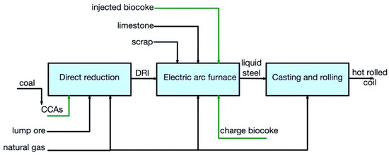 - Yang, F.; Meerman, H.; Faaij, A. Harmonized Comparison of Virgin Steel Production Using Biomass with Carbon Capture and Storage for Negative Emissions. Int. J. Greenh. Gas Control 2021, 112, 103519. [Google Scholar] [CrossRef]