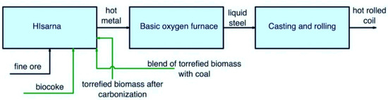 - Suopajärvi, H.; Pongrácz, E.; Fabritius, T. Bioreducer Use in Finnish Blast Furnace Ironmaking—Analysis of CO2 Emission Reduction Potential and Mitigation Cost. Appl. Energy 2014, 124, 82–93. [Google Scholar] [CrossRef]