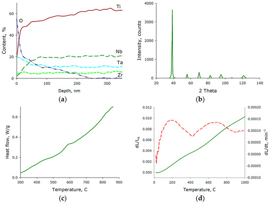 Physical features of Ti-20Nb-10Ta-5Zr alloy: (a) element composition; (b) X-ray phase analysis; (c) function heat flow from temperature; (d) results of dilatometric analysis of the alloy. The red line is the left y-axis, the green line is the right y-axis.