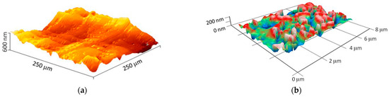 The more detailed surface features were studied by AFM and MIM. It was shown that even in the relatively flat areas, there are folds and longitudinal comb-like structures up to 0.5 µm high (Figure 3a). Crest-like irregularities 100–150 nm high were observed on Ti-20Nb-10Ta-5Zr by both microscopy methods (Figure 3b). More pronounced irregularities were not detected.