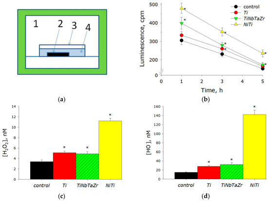 Influence of Ti-20Nb-10Ta-5Zr on ROS and LRPS rate production: (a) Scheme of experimental chamber (1—thermostat, 2—Ti-20Nb-10Ta-5Zr alloy, 3—Petri dish, 4—saline solution); (b) influence of Ti-20Nb-10Ta-5Zr alloy on LRPS rate production (120 min, 40 °C); (c) influence of Ti-20Nb-10Ta-5Zr alloy on H2O2 rate production (120 min, 40 °C); (d) influence of Ti-20Nb-10Ta-5Zr alloy on generation of hydroxyl radicals (2 h, 80 °C). *—p < 0.05 vs. solution without metal samples, two sample two-tailed t-test.
