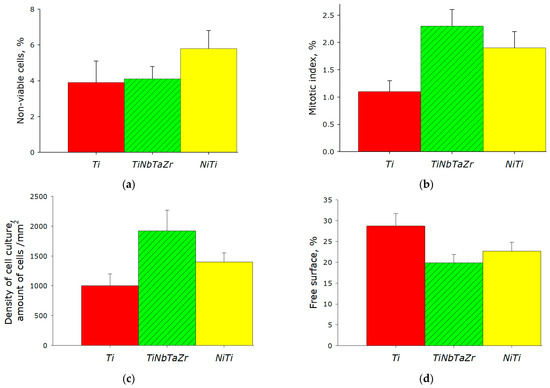 It has been shown that the nitinol and Ti-20Nb-10Ta-5Zr samples are more appropriate for the cells’ adhesion and growth than the titanium surface (Figure 5d). The cells’ culture on the Ti sample occupied a smaller area available for growth compared to the NiTi and Ti-20Nb-10Ta-5Zr samples. The cells did not achieve full (100%) confluency after 3 days of the experiment on all the samples. The culture confluency did not exceed 80% on NiTi or Ti-20Nb-10Ta-5Zr, but it was higher compared to Ti (70%).