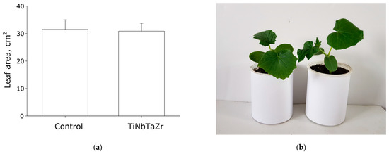 Ti-20Nb-10Ta-5Zr influence on plant growth: (a) average values Solanum lycopersicum leaf areas; (b) photos of Cucumis sativus plants (left—control, right—Ti-20Nb-10Ta-5Zr alloy).
