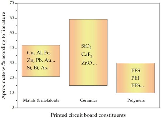 Electronic devices have become commonplace in modern society’s daily life. The global market provides numerous devices that we commonly use, such as smart phones, tablets, laptops, and personal computers. All of these devices are made out of different metals required for construction of printed circuit boards (PCBs), which are an essential functional component of any electronic device. As electronics consumption increases, so does the amount of electronic waste (e-waste). According to the most recent Global E-waste Monitor report from 2020 (GEM 2020), 53.6 million metric tons of e-waste were generated in 2019 and an upward trend is anticipated [1]. E-waste, if not further processed as a secondary resource or safely disposed of, may cause serious environmental damage because it is rich in heavy metals and metalloids, both of which are toxic to the biosphere. The element distribution in the PCBs varies due to the application of the devices for which they are designed. However, in its highest content it consists of metals and metalloids (as low as ≈ 21 [2] up to ≈ 42 wt% [3]), ceramics (in a range from 15 [4] to 59.26 wt% [5]), and various polymer materials (in a range from 10 to 30 wt% [6]), illustrated in Figure 1.