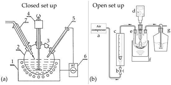 Experimental set-up: (a) closed set-up—1 (thermal bath), 2 (reactor), 3 (sampling neck), 4 (mechanical stirrer), 5 (thermocouple), 6 (thermoregulation), 7 (Allihn condenser); (b) open set-up—a (air compressor), b (air flow valve), c (rotameter), d (mechanical stirrer), e (reactor), f (ultrasonic bath), g (gas washing bottle), 1 (air injecting neck), 2 (sampling neck), 3 (air outlet neck), 4 (stirrer seal neck).