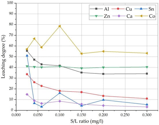 Figure 3 depicts the overall effect of the starting S/L ratio, where all metals except for Co, Zn, and Sn showed similar, descending trends of leaching degree with increasing S/L ratio. This is expected because the higher the S/L ratio, the less leachable media there is to extract the metals into, increasing the insufficiency of the acid and decreasing the amount of metal leached. This happens due to mass transfer limitations, which occur when the leaching rate is limited by the diffusion of metals from the solid surface to the bulk solution. It can be concluded that the leaching reactions for Al, Cu, and Ca are diffusion limited, with almost linear trendlines from 0.1 to 0.3 g mL−1.