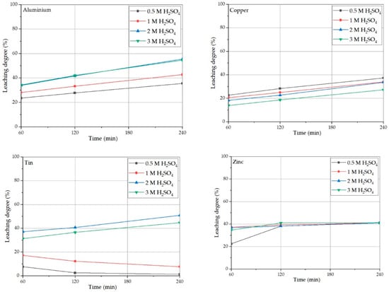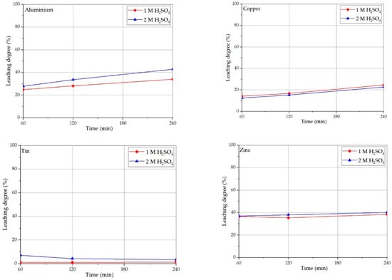 Figure 4 and Figure 5 show how the leaching degrees (Al, Cu, Sn, and Zn) change depending on how long the fine PPCB powder is in contact with different concentrations of leaching solutions. These findings can be combined with the effect of the S/L ratio for the four hours leaching in 2 M sulfuric acid. They show how Al, Cu, Sn, and Zn behave during leaching.