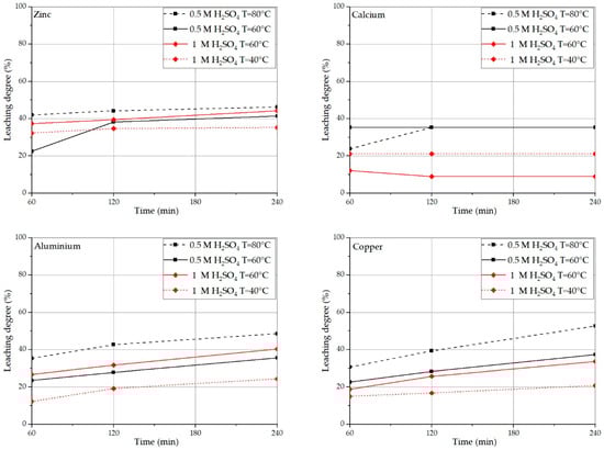 Just as with the acid concentration investigation, the leaching degree of zinc reaches a plateau around 40%. There is a slight difference, however, with a change in leaching temperature. For the temperature of 80 °C, the plateau is around 45% while for 40 °C, the plateau is around 35%. For the lower acid concentration of 0.5 M the plateau is still achieved by the second hour, but for 80 °C the plateau is reached at a higher rate. Since calcium sulphate and its crystal hydrates are poorly soluble in water, all calcium leaching rate trendlines in Figure 6 plateaued after 2 h. Calcium leaching depends on sulfate anion concentration (Ksp(CaSO4, 25 °C) = 3.7 × 10−5 [47]). Red trendlines show expected leaching degrees for the same concentration of acid but at a different temperature (higher temperature–lower solubility [48]), but this trend is not seen for lower concentrations, likely due to gypsum precipitation before quantitative analysis of the solutions. Aluminum corrosion increases with temperature. According to Chen et al. [39], aluminum’s corrosion mechanism changes, and oxygen solubility decreases with temperature, lowering the cathodic current and affecting leaching. Concentration of sulfuric acid should increase copper oxidation, but it also lowers oxygen solubility, so copper extraction is preferable at lower concentrations (Figure 6), especially at higher temperatures when the oxygen diffusion coefficient is higher [49].