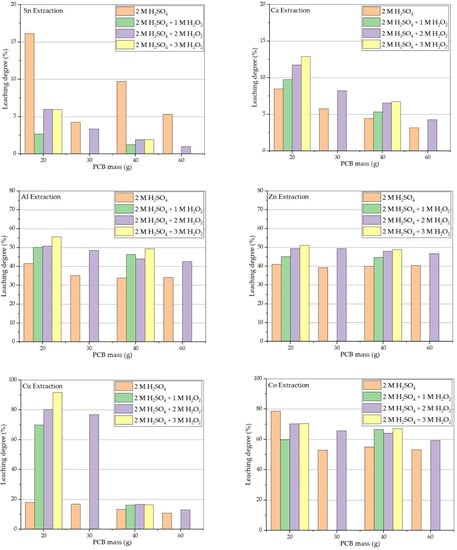 Element extraction after 4 h leaching in 200 mL 2 M sulfuric acid with additions of different concentrations of hydrogen peroxide (1 M 23.46 mL), (2 M 46.92 mL), and (3 M 70.38 mL) for four starting amounts of fine PPCB powders.