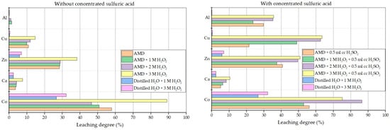 In the closed set series 3, 200 mL of AMD was used as a leaching agent on 20 g of PPCB in the AMD experiments, and the temperature of the leaching solution was kept at 60 °C. One experiment was conducted only with AMD, and three others were conducted with different concentrations of hydrogen peroxide: 1 M H2O2 (23.46 mL), 2 M H2O2 (46.92 mL), and 3 M H2O2 (70.38 mL). All four experiments were repeated with the addition of 5 mL of concentrated sulfuric acid. Furthermore, for the water experiments, 200 mL of distilled H2O was used as a leaching agent on 20 g of PPCB, with the leaching solution kept at 60 °C. The two experiments were carried out with the addition of 1 M H2O2 (23.46 mL), and 3 M H2O2 (70.38 mL). For all of the experiments in Series 3, samples were collected after 4 h.