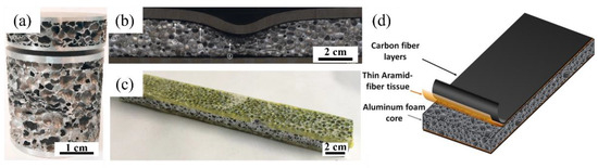 The aluminum foam sandwich (AFS), a typical AFCS, is composed of external solid panels and an internal porous aluminum foam core. According to the service conditions and manufacturing method, titanium, steel, aluminum, wood, ceramic, carbon fiber, and other materials [9,10,11,12] can serve as the above-mentioned solid panels, as shown in Figure 1. The porous aluminum foam core has poor mechanical performance, but the external solid panels of the AFS can bear the main load to protect the core from being destroyed during a crash. At the same time, the aluminum foam core increases the distance between the two solid plates, thereby increasing the second-moment area of the AFS. As a result, the structural stiffness and strength increase. In addition, external deformation energy can be consumed by plastic deformation of the porous aluminum foam core. From the lightweight structure perspective, the low-density aluminum foam core significantly reduces the mass of the AFS, leading to high specific strength and specific stiffness.
