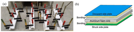 Adhesive bonding is the most direct and effective method to combine the panels and the aluminum foam core, and this method also has the advantages of high efficiency and low cost. The primary preparation process includes the following steps. Firstly, the bonding surfaces of solid panels and aluminum foam core surfaces are polished using sandpaper, ensuring superficial roughness. Secondly, the preprocessed panels and aluminum foam core are cleaned with ethanol or acetone to remove oil and impurities. Thirdly, an adhesive is applied to the preprocessed surface, and these parts are combined under certain temperatures and pressures [17].