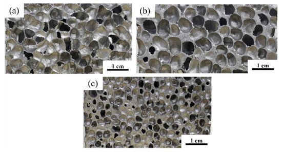 Appearances of aluminum foam cores with various relative densities [25]: (a) 0.11, (b) 0.16, and (c) 0.20. Reprinted with permission from ref. [25]. Copyright 2022 Elsevier.