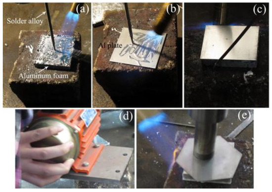 Solders are necessary for braze welding, which are molten and fill the weld area [32,33]. Under certain welding conditions, the brazing method can achieve the metallurgical bonding of an aluminum foam core and sheet metal. The main technological processes are similar to the adhesive bonding method. Firstly, both the core and panels are cleaned to remove the oxide layer and grease. Then, solders are inlaid on one side of the panel and flux aqueous solution is sprayed. Finally, the combined core and panels are placed in a brazing furnace filled with nitrogen [2,34].