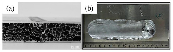 From the perspective of joining technology, friction stir welding can also be used for welding AFSs. A successfully prepared AFS using friction stir welding is shown in Figure 7. Due to high-speed rotation and movement of the stirring head, several small pores were generated at the core and panel mixing area [48]. For internal pore structures, the average thickness of the cell wall for the bonding areas was larger than that of the core material, and an obvious welding interface can be observed. Because of the random foaming, a few large inhomogeneous pores appeared after the agglomeration of foamable particles during the mixing process [53]. Welding marks can be observed on the outer surface of the panels.