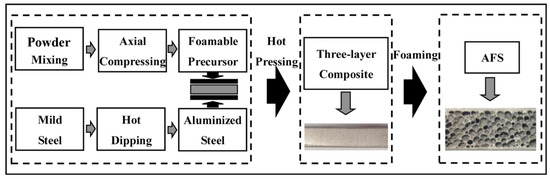 The rolling powder metallurgy method can continuously realize the preparation of large-sized AFSs, the prepared precursor has high densification, and there is a high bonding strength between the panels and the core. The agglomeration of foaming agents can be effectively solved by controlling the foaming temperature, rolling pressure, foaming agent content, and powder mixing process.