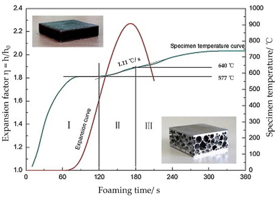 Expansion and temperature curves vs. foaming time of an AFS [61]. Reprinted with permission from ref. [61]. Copyright 2022 Elsevier.