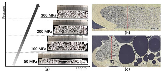 Macroscopic morphology of an AFS [62]. (a) The final cellular structures of an AFS after foaming durations of 600 s at 640 °C of which foamable precursors were obtained under different pressures, (b) microstructure of the precursor obtained by cold prepressing and hot pressing under a pressure of 200 MPa, and (c) the cellular structure of the precursor after foaming. Reprinted with permission from ref. [62]. Copyright 2022 Elsevier.