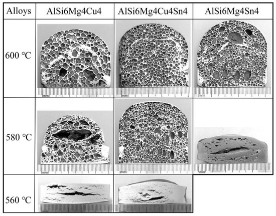- Ding, X.; Peng, B.; Hu, X.; Pan, K.; Liu, Y.; Wan, T.; Ran, S. Effect of Cu and Sn additions on the cellular structure of Al–Si–Mg alloys foaming at low temperature (≤600 °C). Compos. Part B Eng. 2022, 234, 109693. [Google Scholar] [CrossRef]