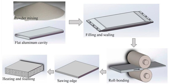 The densification process of this type of powder metallurgy method is rolling [64]; in this process, the panels and the mixed powders are compacted by extrusion and compound rolling to obtain a foamable precursor. Rolling is a continuous process, so the rolling powder metallurgy method is suitable for industrial production. To improve the densification of the precursor, the rolling process is usually implemented under high temperatures [65], and then the prepared precursor is heated in a furnace to an appropriate temperature for foaming. With the increased temperature, the precursor transforms to a semi-melting state, and the decomposition of TiH2 occurs at the same time; as a result, bubbles are generated. Simultaneously, atom diffusion occurs between the panel and the core, forming intermetallic compounds and achieving an ideal metallurgical bonding state.