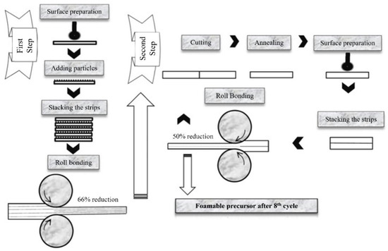 Based on the powder metallurgy method, Kitazono [75] proposed a novel practical technique for fabricating closed-cell aluminum foam plates using cumulative roll welding (ARB). Hosseini [76] prepared an AFS using continuous annealing and roller compression (CAR). These two methods realized the preparation of the AFS and the main routes for ARB and CAR were roughly the same. As shown in Figure 15, the main processes are divided into two steps. Firstly, a stack of pretreated aluminum strips is prepared, then stacking strips and certain TiH2 particles are added between each of the two strips, after that the stacked strips are rolled together. The second step is a repeat loop to ensure the home dispersal of the TiH2 particles. The rolled strips are cut into two or several pieces and surface treatment is performed, then the treated strips are stacked together and rolled together again. After repeating this process for about the 8th cycle, a foamable precursor is prepared. The foaming process of the precursor is similar to other powder metallurgy methods.
