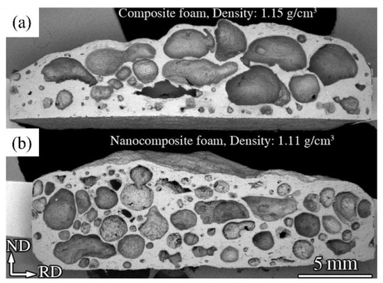 Macroscopic structures of an aluminum foam plate [76] (a) without and (b) with SiC particles. Reprinted with permission from ref. [76]. Copyright 2022 Elsevier.