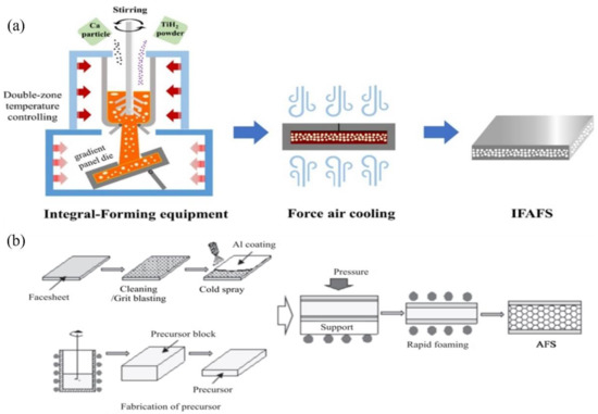 Schematic diagram of a melt-foaming-fabricated AFS, (a) pouring method 1 and (b) two-step foaming method. [1,79]. Reprinted with permission from ref. [1,79]. Copyright 2022 Elsevier.