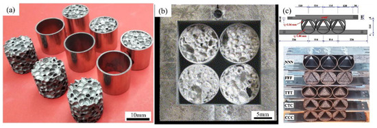 Some prepared FFTs: (a) aluminum-foam-filled circular tubes [92], (b) square-packed multi-tube designs [93], and (c) aluminum-foam-filled inlaid tubes [94]. Reprinted with permission from ref. [92,93,94]. Copyright 2022 Elsevier.