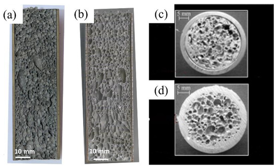 Figure 20 shows some FFTs prepared using the ex situ approach, where the aluminum foam cores were fabricated using melt foaming technology and powder metallurgy foaming technology. From Figure 20a, the aluminum foam core of FFTs prepared using melt foaming technology appears to have a relatively uniform pore structure, and its shape is mostly round or oval [97]. However, in Figure 20b, the core prepared using powder metallurgy technology shows an uneven pore structure and irregular shape [98]. Additionally, obvious macroscopic gaps between the aluminum foam core and the metal tube were detected.