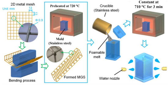 - An, Y.; Yang, S.; Zhao, E.; Wang, Z. Fabrication and experimental investigation of metal grid structure-reinforced aluminum foams. Mater. Manuf. Process. 2018, 33, 528–533. [Google Scholar] [CrossRef]