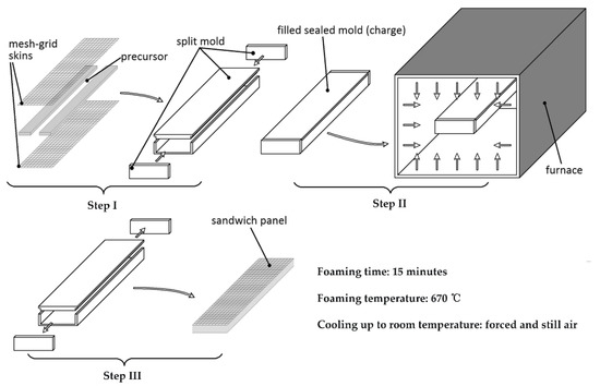 The cold- and hot-pressing powder metallurgy method is a widely used method for fabricating an AFS. The main processes [55] include mixing powder, cold pressing, hot pressing, and foaming, as shown in Figure 8. Appropriately extending the mixing time can improve the uniformity of the achieved AFS. The purpose of cold pressing is to form a bulk material from powders to transfer it from one mold to another, because the molds for cold and hot pressing are sometimes different. Hot pressing is a critical process to achieve a dense precursor core and a good bonding strength between the precursor core and the panels. The adjustable parameters are pressure, time, and temperature. Foaming is the last step, in which the density and pore size of the core can be controlled by adjusting the foaming time and temperature. Additionally, this process improves the bonding strength between the precursor core and the panels.